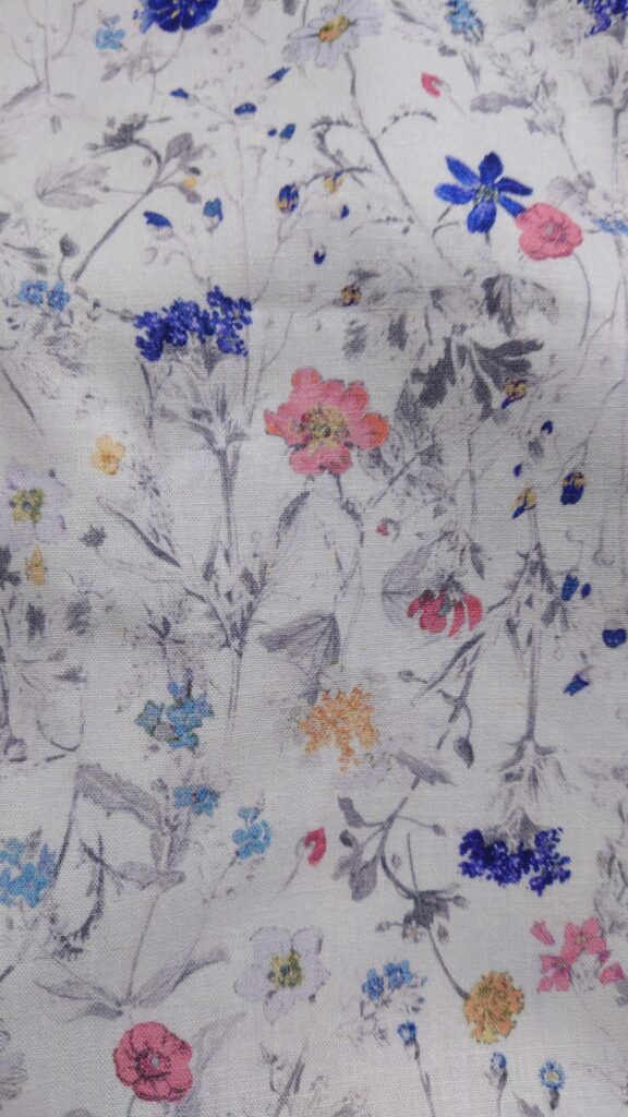 2点目。こちらはNuno Mittelさんで購入。リネンレーヨンの生地です。1点目と同じく地の色はホワイトなのですが、こちらはカラフルな花柄です。でも柄が大きすぎず、うるさすぎないので上品な花柄のワンピースが作れると思います。ちょっとお高めの生地だったため、とりあえず3mあれば大丈夫だろうと購入しました。