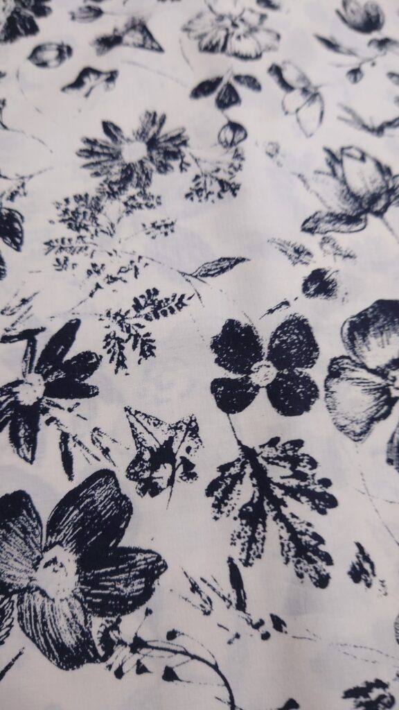 1点目。こちら鎌倉スワニーさんのアウトレット生地で5m購入したもの。生地の種類はコットンローン(だったはず)。地の色がホワイト系で花柄なのですが、黒で描かれているためシックでちょっと大人っぽい雰囲気になるのでは?と考えています。5mもあるので多少失敗してもリカバリが効くという打算もあります。