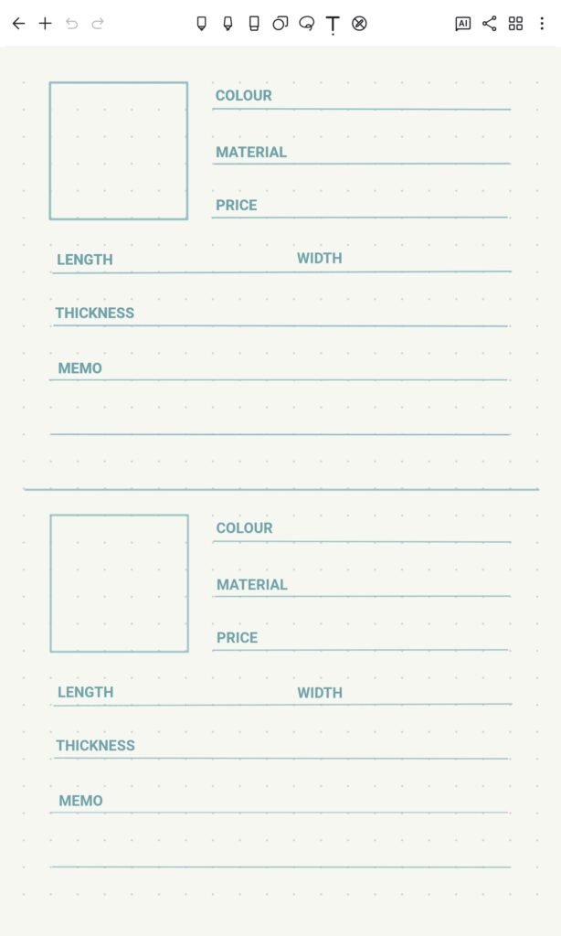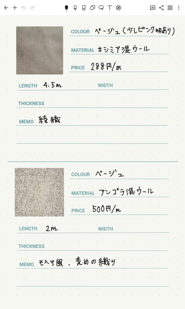 よく考えたらタブレットにはカメラがついているので、生地の写真を撮ってノートアプリに取り込んで生地の説明を書けば立派な生地帳になるではないですか! 早速、ノートアプリでテンプレートを作ってみました。