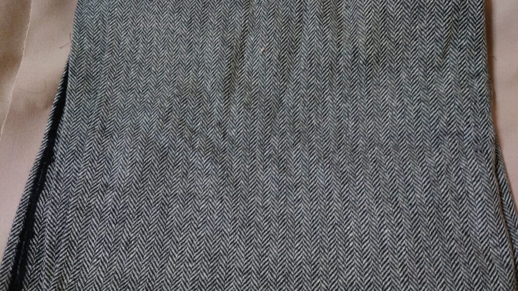 ヘリンボーン柄はダブル幅で1.6mあって、いろいろなものが縫えそうな用尺です。一方チェック柄は0.8m(着分と値札にはありました)しかありませんがダブル幅なのでシンプルめなスカートなら縫えそうです。